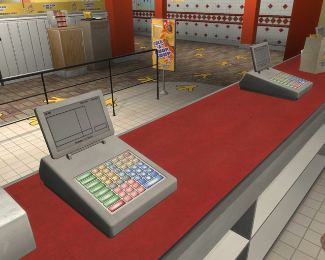 On the cash register of Cluckin' Bell restaurants, you can see the text on it likes: "Holy Shit", "Veg Crap", "Medium, Extra Medium, Medium XL", "Ask CJ", "Launch Missiles", "Space Lazer" etc.
