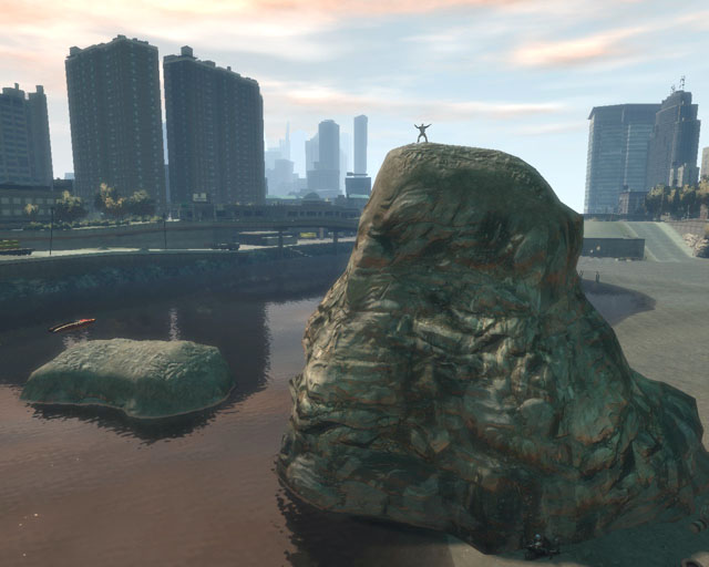 Within the Statue of Happiness is a giant beating heart, supposedly the "Heart of Liberty City." In GTA IV, access into the area is only achievable via an entrance marked by a "No Hidden Content This Way" sign at the upper level of the statue's pedestal, which can only be reached by helicopter. Once inside the pedestal, the player must scale a ladder up to the midsection of the statue, where the heart is located. It can be shot at, but nothing happens. In The Ballad of Gay Tony, if you drink too much, you will re-spawn at random locations, one of which may be the Heart of Liberty City.