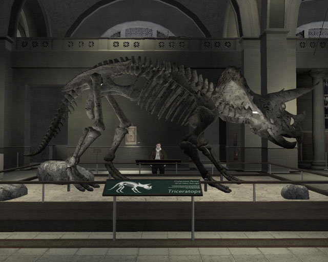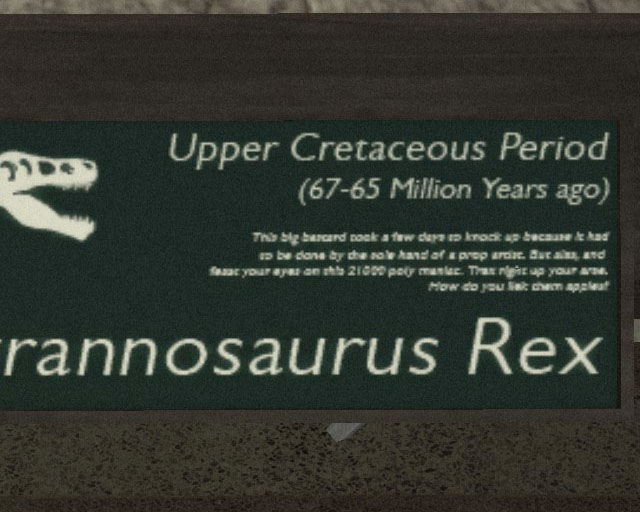 There is an easter egg in The Libertonian; the plaque describing the Tyrannosaurus Rex and Triceratops. The texture of the text is low-resolution, and thus hard to read properly, but reads, roughly: